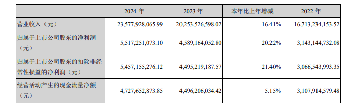 在白酒产业处于深度调整期的2024年,古井贡酒实现营收235.8亿元,同比增长16.4%;实现归属于上市公司股东的净利润55.2亿元,同比增长20.2%。