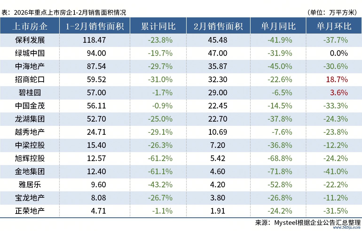 从累计销售面积来看,1-2月,保利发展、中海地产及绿城中国3家重点房企销售面积位列前三,分别为118.49万平方米、94万平方米和87.54万平方米。
