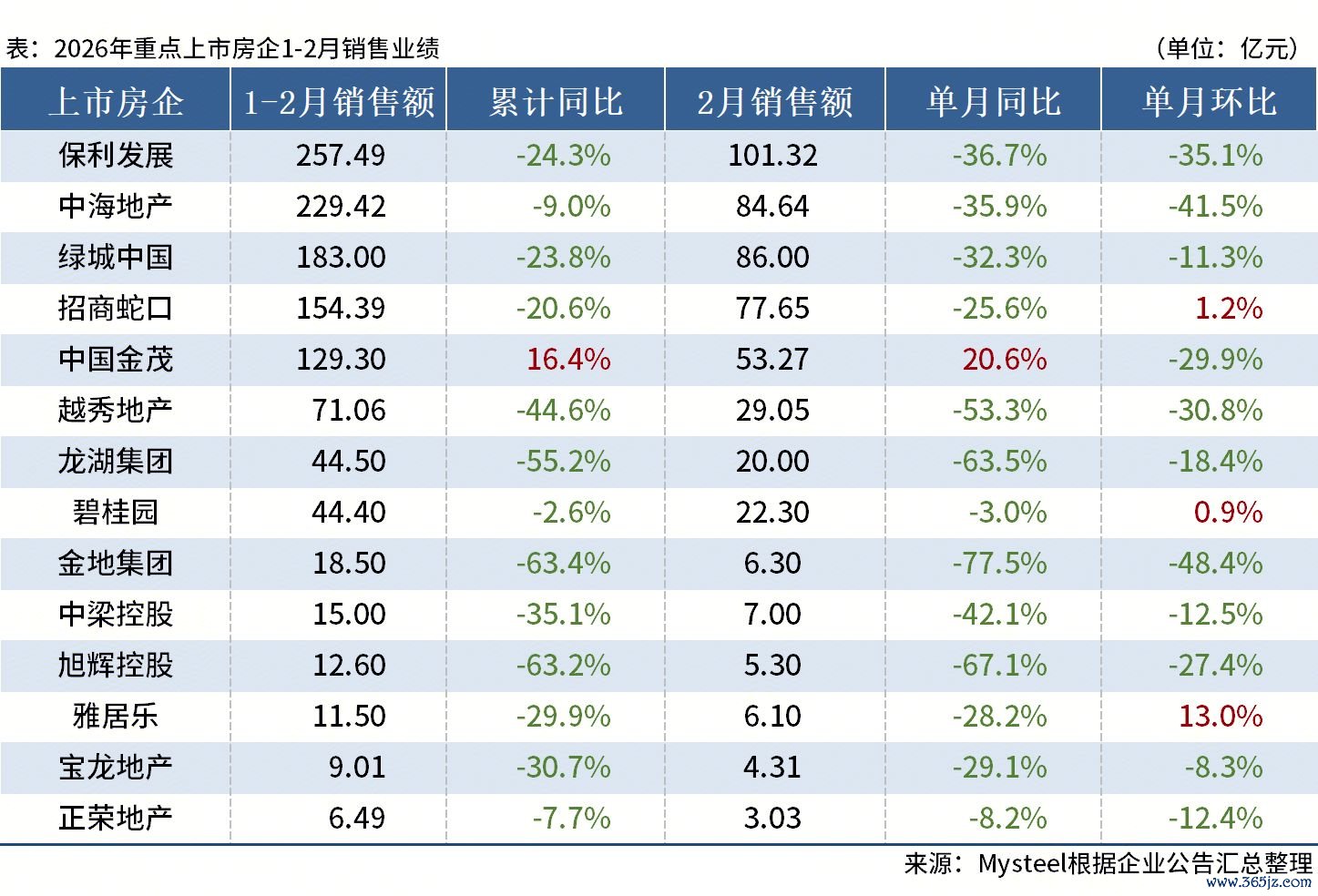 据Mysteel统计,14家重点房企2026年1-2月销售额合计1186.66亿元,同比下降23.7%;2月销售额合计506.27亿元,同比下降35.2%,环比下降25.6%。具体如下: